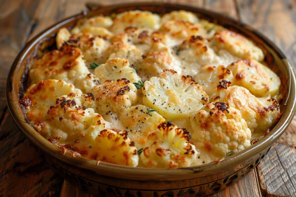 Gratin de chou‑fleur et pommes de terre au fromage.